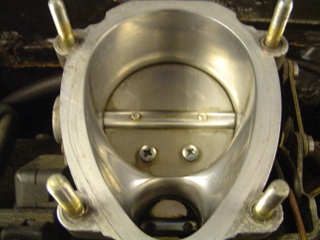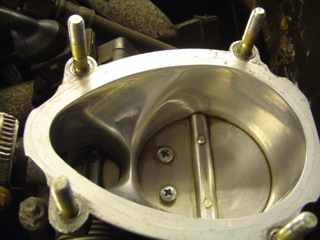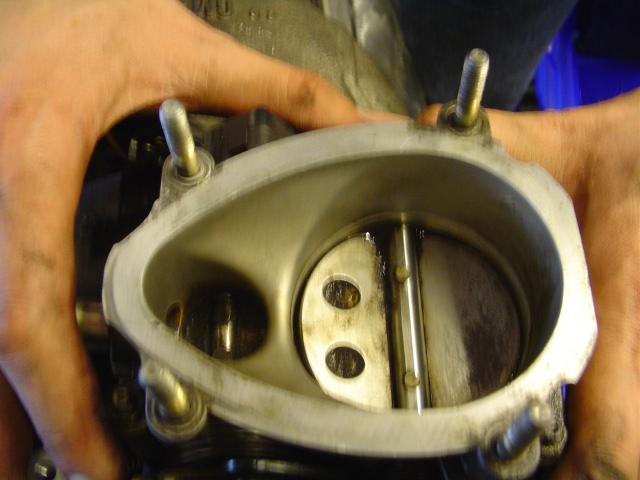 Zoals je kunt zien is de klep nu verder vlak. Ook is dit gasklephuis gepolijst, dit zorgt voor een betere flow. Spoel het gasklephuis voor de zekerheid grondig door met remmenreiniger. Mochten er nog kleine stukjes metaal inzitten, dan worden deze eruit gespoeld.