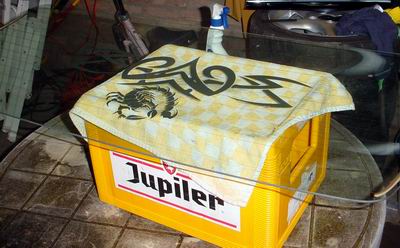 – Goede kwaliteit folie. – Superscherp afbreekmesje. – Plantenspuit met een oplossing van zeepsop en warm water. – Strijkspachtel. – Water en spons. – Föhn. – Blanke en zwarte nagellak. – Touw 2 a 3 mm doorsnede dat 1,5 keer de omtrek heeft van de grootste ruit. – Iemand die af en toe kan assisteren.