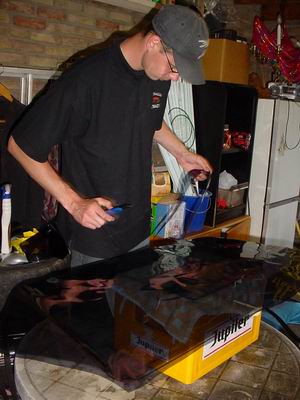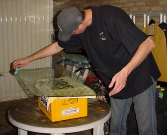 Leg het raam op een steun, een leeg kratje bier met handdoek tegen krassen werkt prima. Snij de folie op lengte en maak het raam iets nat, hierdoor blijft de folie iets beter liggen en verschuift minder snel. Snij de folie nu gelijk aan de ruit, let erop dat de folie niet verschuift, eraf gaat heel snel maar erbij gaat niet meer. Let er goed op wat de binnen- en de buitenzijde is van de folie voor je begint met snijden!! Controleer dit even door een stukje wat je eraf gaat snijden los van elkaar te trekken.Wil de beschermlaag echt niet loslaten dan helpen 2 stukjes tape (1 aan de binnen- en 1 aan de buitenkant) ook om de folie van de beschermlaag los te krijgen.