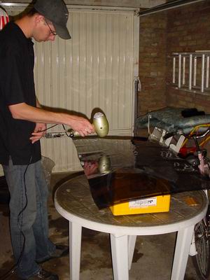 Laat de lak drogen en leg het rubber om de ruit. Plaats het touw in de groef van het rubber welke in de raamstijl/sponning komt en laat de uiteinden overlappen/kruisen op het langste deel van de ruit. Zet de ruit met rubber nu in de langste zijde van de raamstijl/sponning en laat de uiteinden van het touw aan de binnenzijde eindigen.
