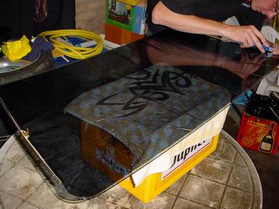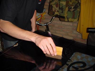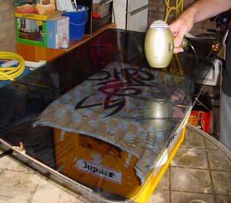 Strijk nu het water echt weg tussen de folie en de ruit, ook hier van midden naar buiten. Nu zal de folie wel vast kleven en niet meer verschuiven. Let erop dat er uiteindelijk geen water/sop achterblijft tussen de folie en de ruit. Bij moeilijke stukjes kun je de folie iets soepeler maken, door de folie te verwarmen met een föhn.
