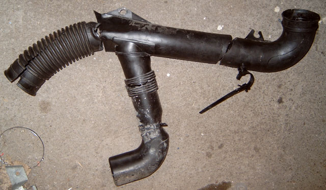 Nu kan het grote karwei beginnen. Begin links, waar het luchtfilter vast zat, haal gewoon alles weg, met wat je maar tot je beschikking hebt, knippen met de zijkniptang gaat ook goed. Maar ja, de slang achter het blok, deze wil niet naar links en niet naar rechts, Door het doodlopende stuk, dit stuk moet er dus eerst af, aangezien je er dus niet van boven bij kunt moet je het van onderen doen. Als je een brug tot je beschikking hebt is dit het makkelijkste, maar gewoon opkrikken zodat je er onder kunt is al wel voldoende (wel minder makkelijk) Kijk goed wat het doodlopende stuk is, dit zie je snel genoeg. En haal hm tot bovenaan weg. Misschien ook handig met een Dremel ofzo. Kijk uit dat je geen andere dingen doorhaalt. Hierna kan je pas, na evt nog wat knippen en doen de slang er helemaal uit trekken. Na wat gepuzzel heb ik hm weer zoalstie was en dan zie hij er zo uit:
