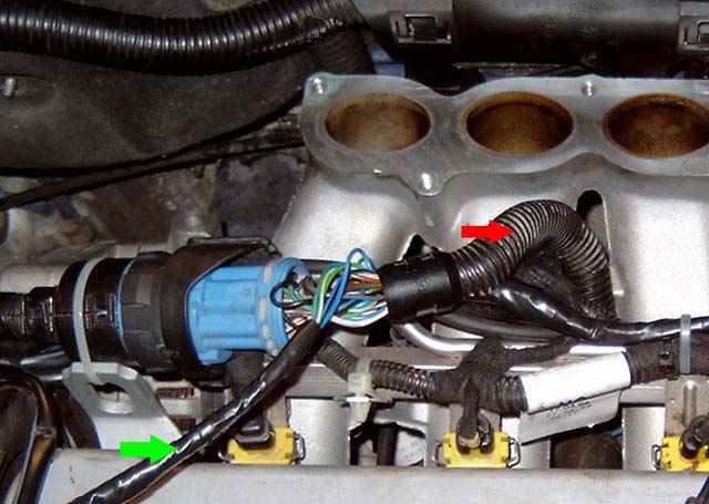 Je ziet een rode pijl, hierin zitten de draden die naar de EGR-klep gaan, en naar de 2 sensoren op je gasklep. Maar aangezien je gasklep nu aan de andere kant van je blok komt en de EGR blijft zitten moeten we deze draden wat aanpassen. Haal de stekker van de EGR-klep los (weet je deze niet te vinden, volg het kabelboompie van de rode pijl naar achteren) Nu kan je alle draden door het uitlaatspruitstuk naar boven halen. Nu kan je de 3 stekkers wat uit elkaar leggen, nu merk je dat er een paar draden gezamenlijk zijn. De zwart/witte en bruine kabel moeten ongeveer met 50cm verlengt worden, zodat de kabelbomen uit elkaar kunnen. Doe dit dmv solderen, doe er dan nog een krimpkous omheen zodat het afgeschermd is. Dan kun je de 2 stekkers van het gasklephuis naar links leggen en de die naar de EGR-klep weer aansluiten. Ik heb de draden van de sensoren netjes ingetaped, ziet er netter uit en het is beschermd. Zie de groene pijl op de foto.