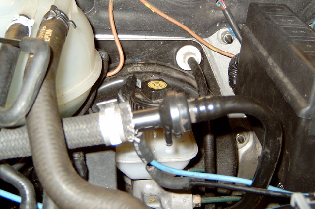 De Stofzuiger heb ik hier ook weer gemonteerd. Dan sluiten we de dikke slang, met stofachtige huls, aan op de Powerbox (rode pijl) Deze moet op het ding vanaf je hoofdremcilinder komen (blauwe pijl)