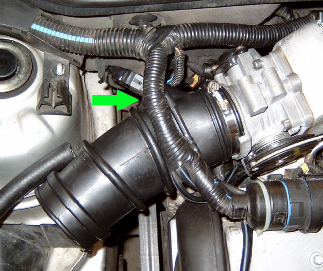 Haal de stekker van de luchtmassameter los en haal de luchtmassa meter uit de slang, Gewoon eruit trekken en bewegen, zit verders niet vast. Deze plaatsen we later in de nieuwe slang