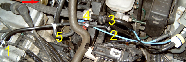 Punt 1: vastmaken aan het blok > de kleine carterontluchting Punt 2: deze komt van rechts vanaf de sensor bij het wit/gele vandaan Punt 3: deze zit vast aan de kleine aansluiting aan de dikke slang die van Powerbox naar hoofdremcilinder loopt. Punt 4: deze zit vast aan het slangetje die vanaf de sensor met de blauw/rode stekker komt Punt 5: deze zit vast aan het slangetje die vanaf het ronde ding aan het blok komt (rode pijl)